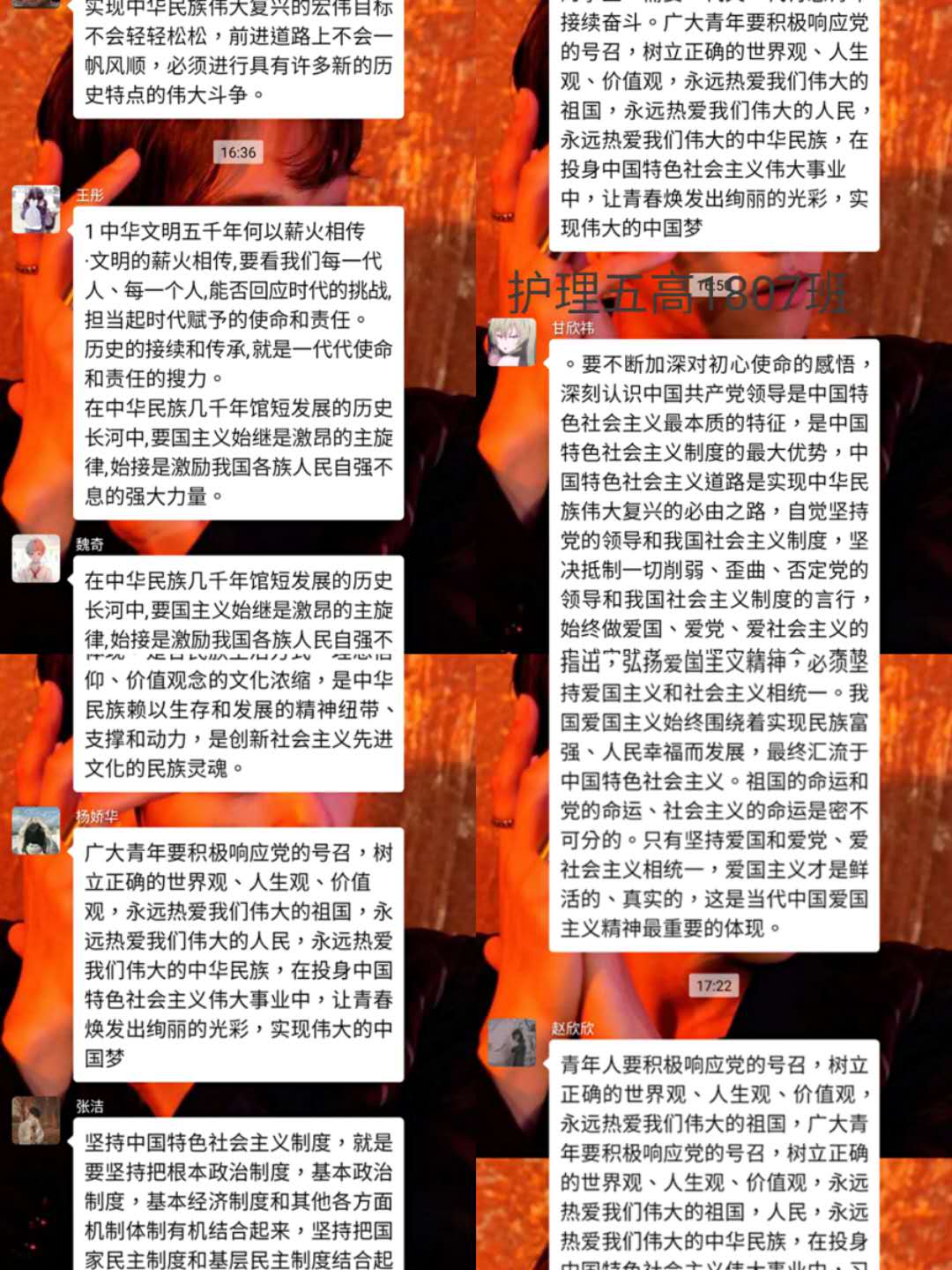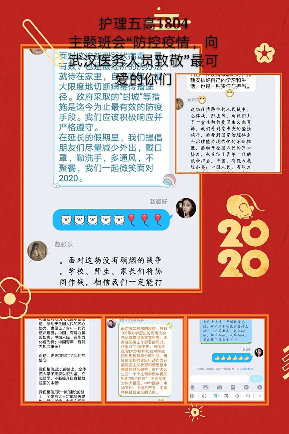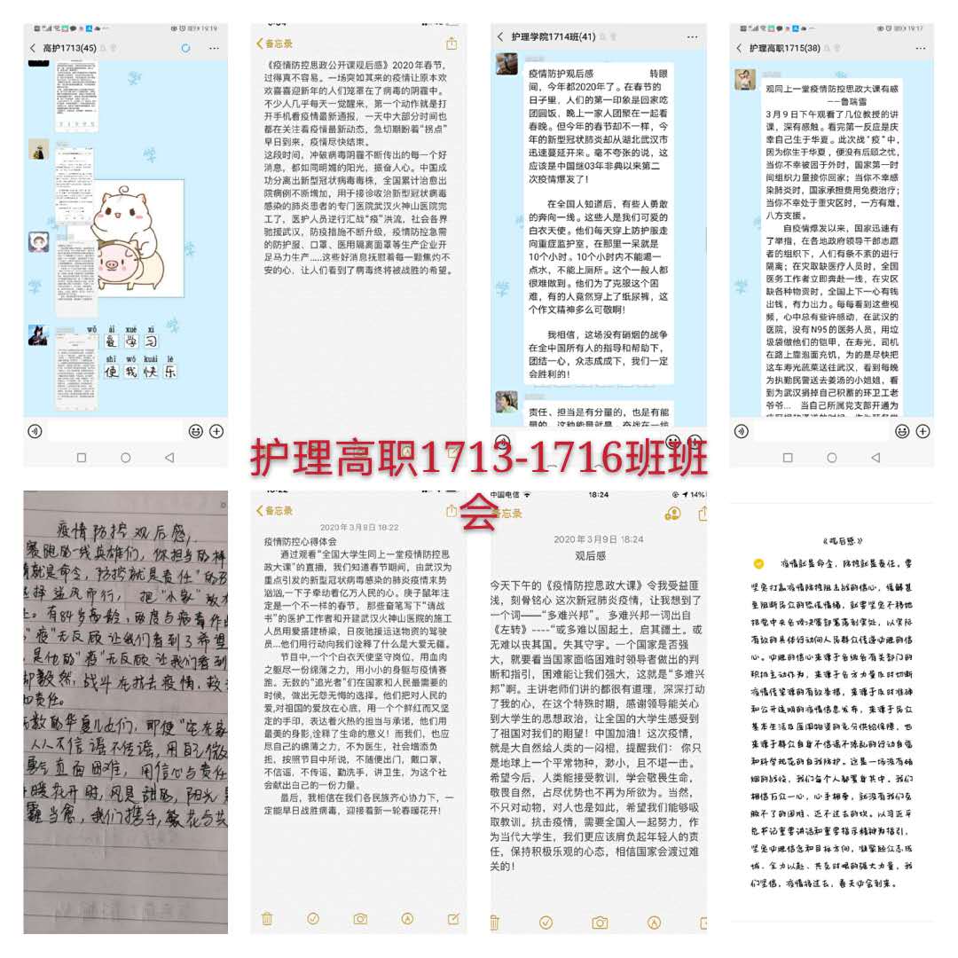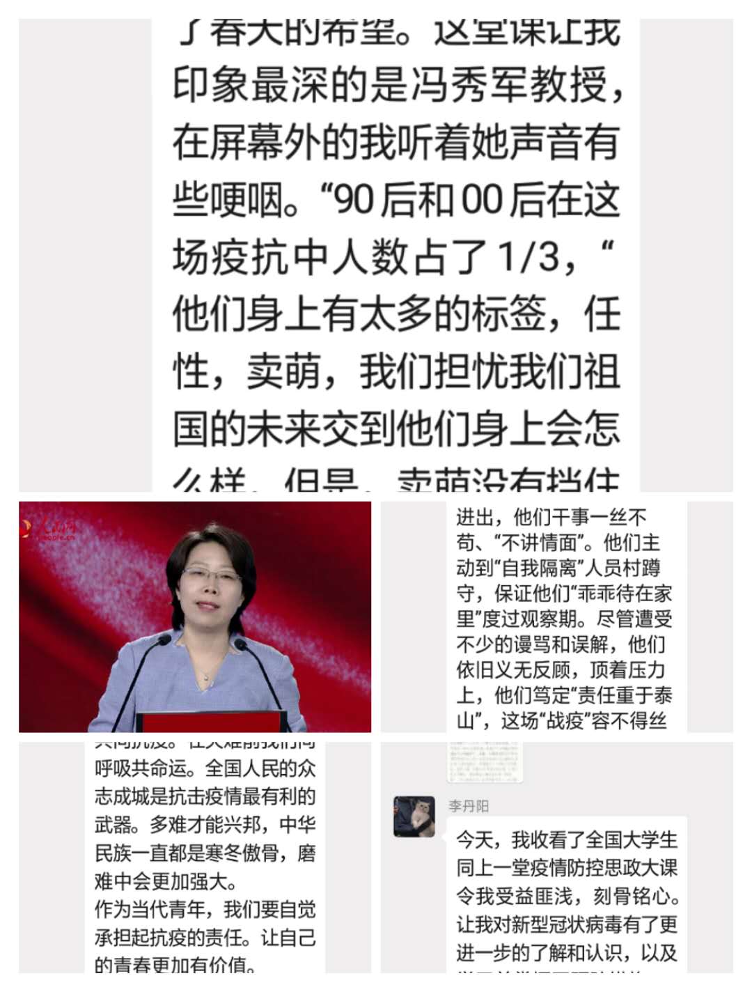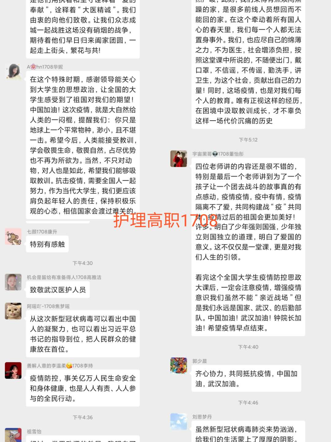 观看结束后,pp电子学生以班级为单位,在学管人员的指导下,开展了线上主题班会。师生们结合学科专业特点展开了讨论。pp电子游戏平台网站党总支书记吴运胜认为:“对于pp电子游戏平台网站的师生来说,这次思想政治教育课安排得很及时。在这场战‘疫’中,党和政府从历史中总结经验,担起人类命运共同体的责任,用‘武汉封城’的强大魄力,向世界彰显了中国共产党领导和中国特色社会主义制度的显著优势。作为党的教育工作者,我们要积极教育引导广大学生,坚定在以习近平同志为核心的党中央坚强领导下打赢这场疫情防控人民战、总体战、阻击战的信心和决心。”党总支副书记马淑红认为:“课堂中的战疫小故事,让我们看到了当代青年的大勇、大我和大德,我们要积极宣传学生身边的榜样事迹,继续引导广大青年学生勇担使命,积极奉献社会,为实现中华民族的伟大复兴梦而奋斗。”学生科科长李博认为:“这堂公开课兼具思想高度和理论深度,有数据有实例,有情感有温度,进一步增强了大学生的‘四个自信’,激发大学生的爱国热情和创新创业的动力。”护理高职1804班学生王晔在班会中说:“作为一名00后护生,我们要牢记医学生誓言和南丁格尔誓言,向奔赴疫情前线的前辈学习,做到胸有大志、心有大我、肩有重任、行有大德,用实际行动谱写自己大写的青春。”(撰稿:pp电子游戏平台网站 王蓉 审核:李晓乾)