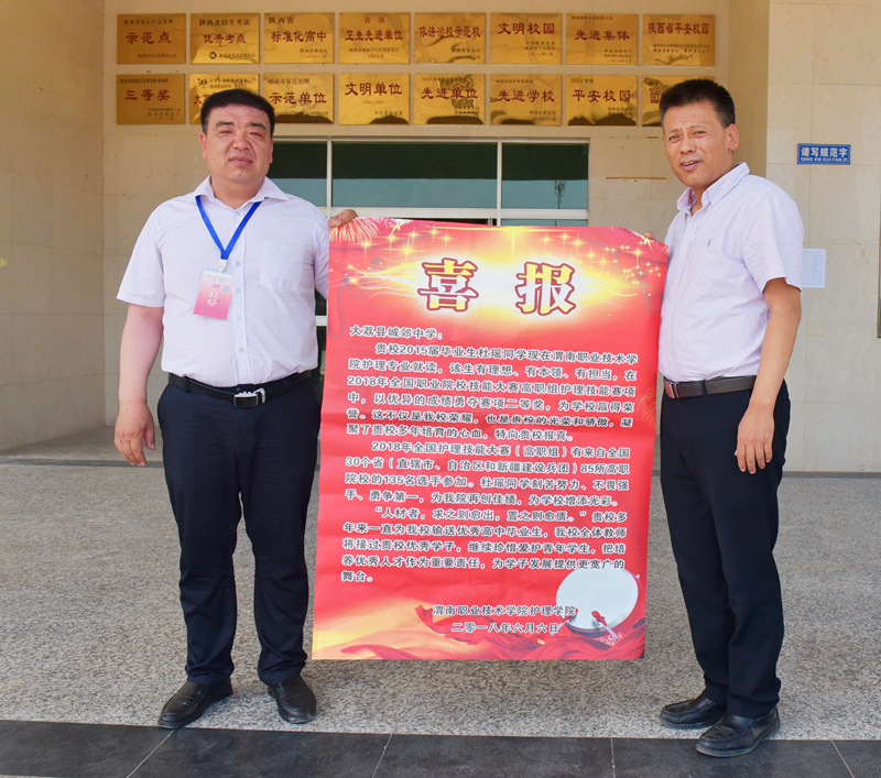 pp电子院长张文信、副院长王医平、办公室主任张王孝也将牟洋洋同学在2018年全国职业技能大赛护理赛项三等奖的好消息汇报给她的母校及家长。在临潼中学,张文信将载着学生荣耀的“喜报”交到学校副校长魏全良手上,与该校师生一起分享育人喜讯。魏全良希望与我校保持合作关系,让更多的学生发光出彩。在牟洋洋同学家中,张文信向学生家长递上“喜报”,向学生家长表达了祝福和感谢,希望家、校一体,继续信任合作,共同为学生扬起绿色的航帆。(撰稿:pp电子游戏平台网站 王蓉 审稿:吴亚飞)