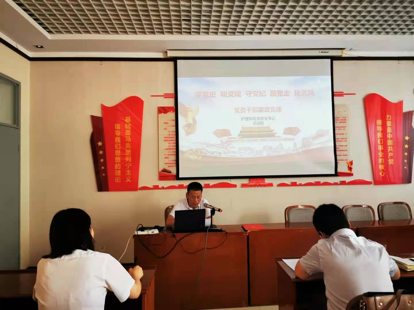 活动开始,首先由吴运胜书记带领全体同志重温入党誓词。随后,吴书记以“学党史、明党规、守党纪、跟党走、扬党风”为主题为全体同志讲党课,他紧紧围绕党课主题讲了党员干部应该具备的四种素质:一是政治素质,一个党员干部的政治立场、政治观点和政治品质永远居于首要和根本地位。二是道德素质,党员干部的道德素质要求其具有团结协作的胸怀、宽以待人的修养、谦虚谨慎的态度、服务师生的意识、廉洁自律的品格、无私奉献的品德和勤俭持家的美德。三是知识素质,作为党员干部只有不断地学习和更新知识,才能适应工作的需要。四是作为领导干部在工作中尤其要注重实践锻炼、注重自身修养、注重管理能力和演讲写作能力的提升。吴书记在党课过程中立足工作实际,坚持问题导向,用娓娓道来的讲述和发人深省的启示让党员在聆听故事的同时受感染、受教育、受启迪,极大地增强了党课的感染力和吸引力。
