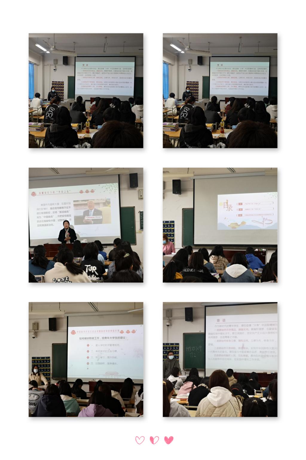 各位领导、老师用真实的数据和鲜活的事例,阐述了全球历史上发生的传染病疫情对社会发展格局的作用和本次新冠疫情形势对全球政治经济秩序、治理体系变革的重大影响,讲述了新冠肺炎疫情对全球经济社会运行造成的巨大冲击。结合学校推行的“宿舍三进”“课堂三巡”等学生管理工作,利用本次思政课主题班会向学生讲述了学校当前的防控举措,既是贯彻落实习近平总书记关于疫情防控工作的重要指示精神,落实省委教育工委、省教育厅和市委、市政府的决策部署,更是确保师生生命安全和身体健康的有力举措,让学生更加充分地理解学校的封控制度,并自觉践行。老师们热切祝愿新时代的青年大学生,要在疫情“大考”中汲取精神力量、涵养家国情怀。