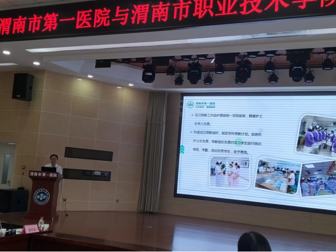 渭南市第一医院书记冯晓峰代表医院致欢迎辞,他指出作为我校的实习教学医院,院方会一如既往精心带教、严格管理。希望医校双方本着优势互补、共同发展、互信双赢的原则,在师资培养、专业建设、学生实践等方面开展深度合作,进一步探索高等教育与医疗卫生事业协同发展的新型合作模式,从而达成医院与学校共同成长、共同发展的“双赢”目标,为我市医疗卫生事业的腾飞而不懈努力。