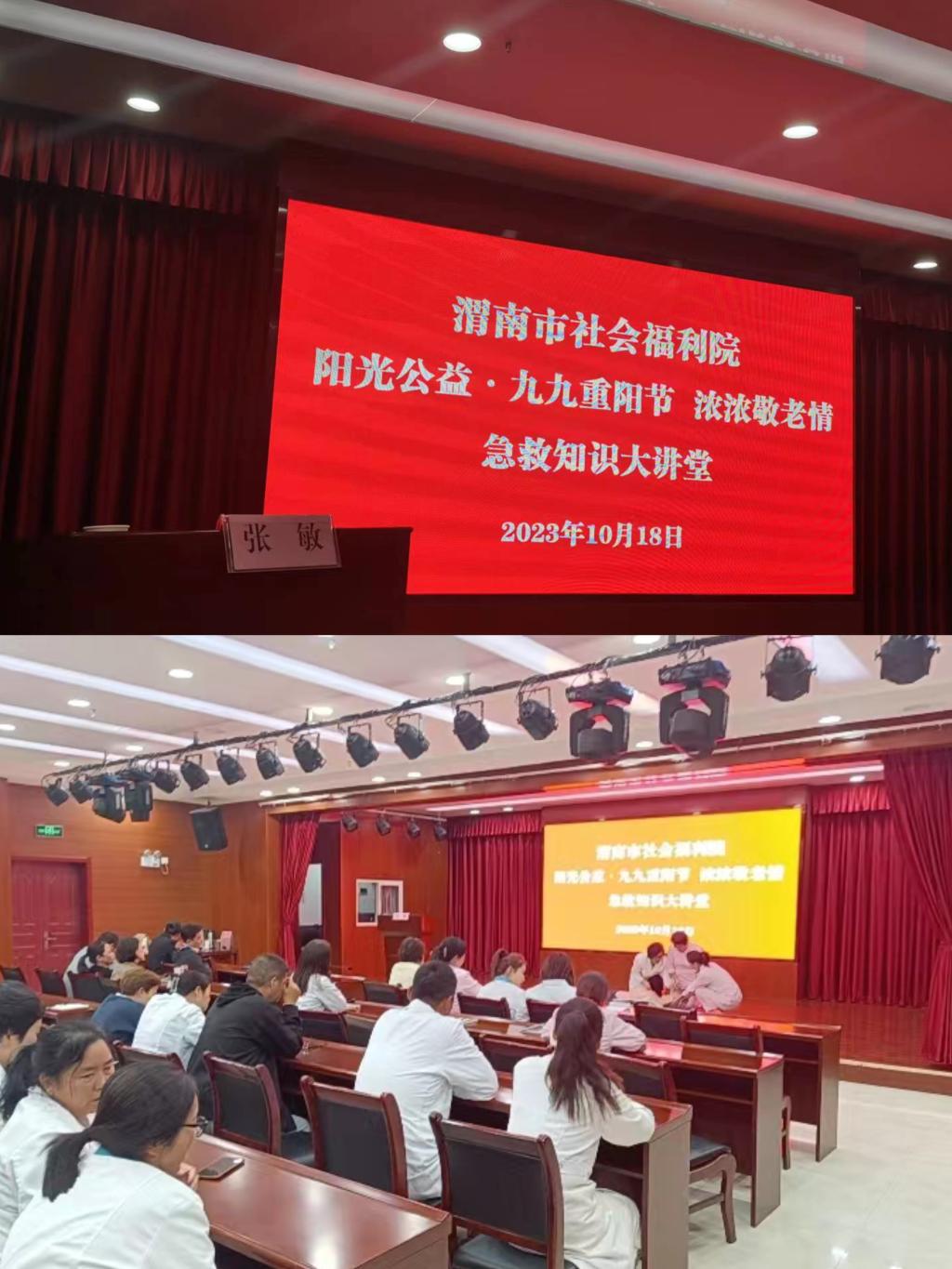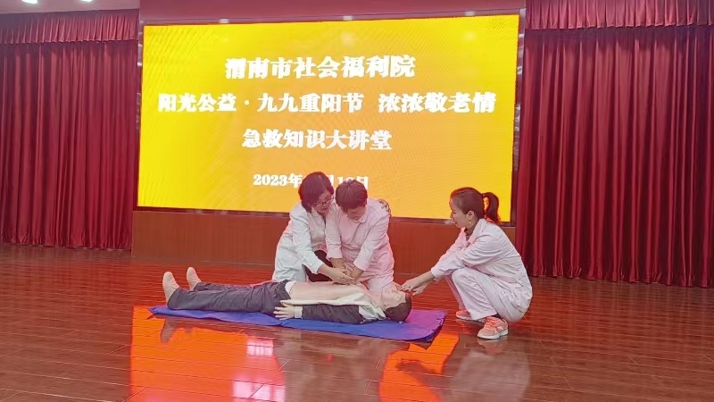 为弘扬敬老爱老的优良传统,丰富辖区老年人的精神文化生活,在九九重阳节来临之际,受渭南市社会福利院邀请,我校pp电子游戏平台网站教师张敏参加了“阳光公益·九九重阳节 浓浓敬老情急救知识”大讲堂活动,助力pp电子双高建设。她通过“心脏骤停的患者如何做心肺复苏?气道异物梗阻的患者如何救护?”等两部分为大家详细介绍了如何判断心脏骤停,心脏骤停后的胸外按压、开放气道、人工呼吸等方法及气道异物梗阻的原因、表现、海姆立克急救法的原理、操作方法等。为了让大家更好的掌握这些知识,让护理员切身体验操作的方法,张敏在现场给予详细、耐心的实操指导。