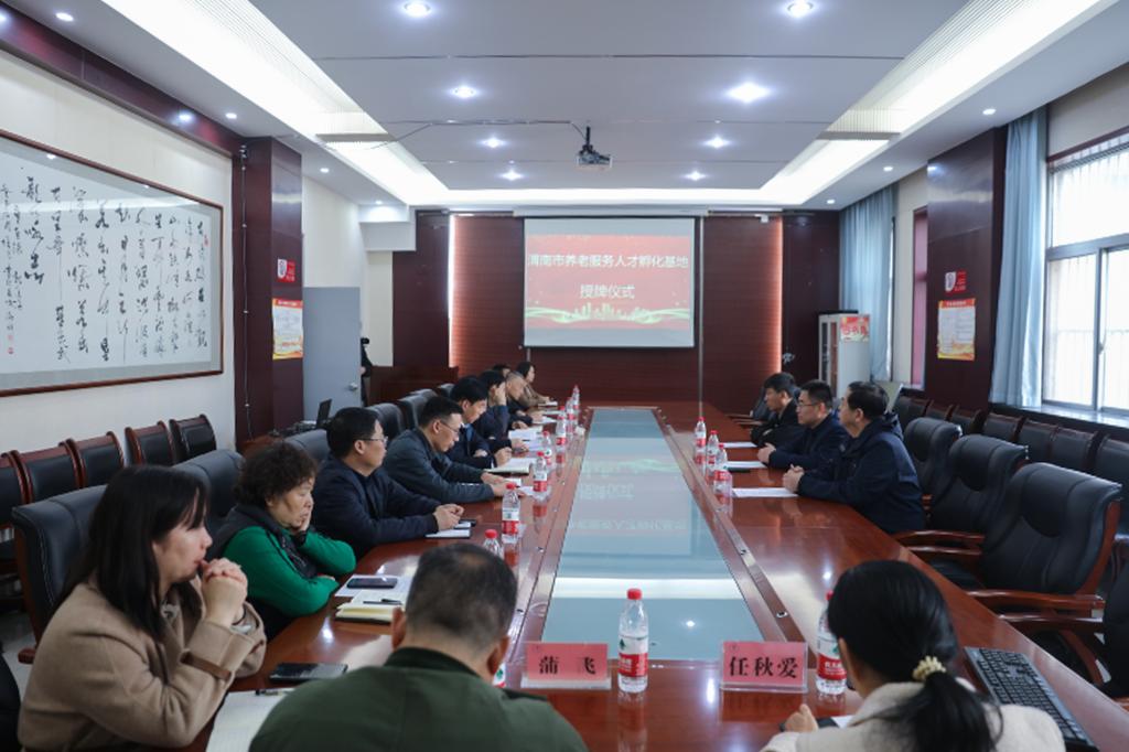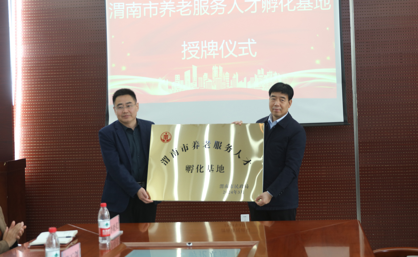 3月22日上午,“渭南市养老服务人才孵化基地”授牌仪式在我校医训南楼第一会议室进行。学校党委副书记王录军,渭南市民政局四级调研员李锋、社会福利科科长杨志宏、科员杨凯及我校医护两院负责同志,各相关部门负责人参加。会议由教务处魏恒处长主持。