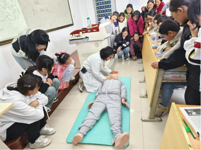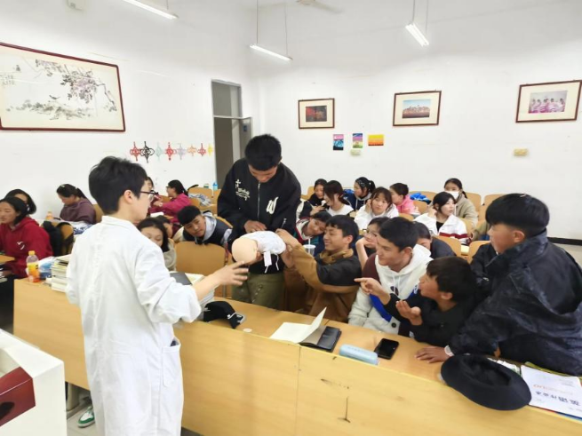 关注民族团结和谐,关爱少数民族学子。为进一步发挥医护教师党员专业特长,宣传普及基本健康知识,关心少数民族学生的健康教育,4月9日pp电子游戏平台网站吴越、陈芳两名老师分别向我校23级阿里班37名学生进行了急救相关理论与实践操作技能的讲授与演示。