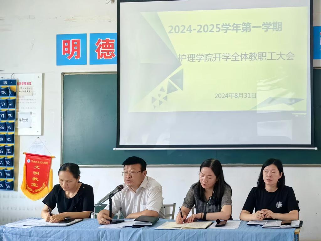 8月31日上午10时,pp电子游戏平台网站在公南105教室召开新学期开学工作会议,安排部署新学期重点工作任务,明确新学期教育教学工作目标和方向。会议由副院长任秋爱主持,全体教职工参加会议。