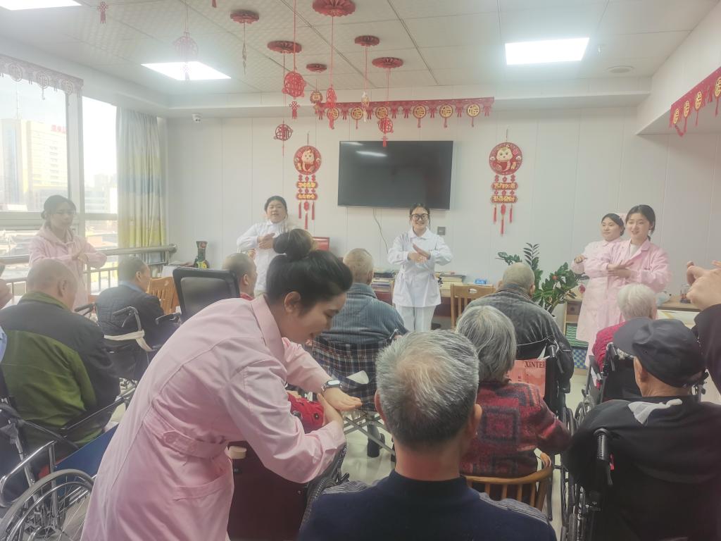 学生利用文娱活动时间为老人开展了别开生面的手指操训练活动。学生们为老人带来了以中医经络理论为基础的自编手指操,配合老年人易于接受、节奏明快的民族音乐《中国味道》,丰富了老人的娱乐生活,提高了老人手脑协调能力,达到改善老人大脑健康和强身健体的效果。