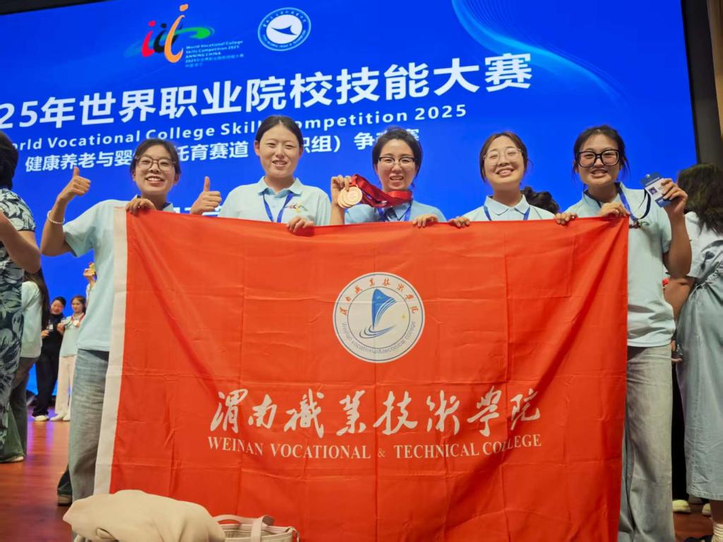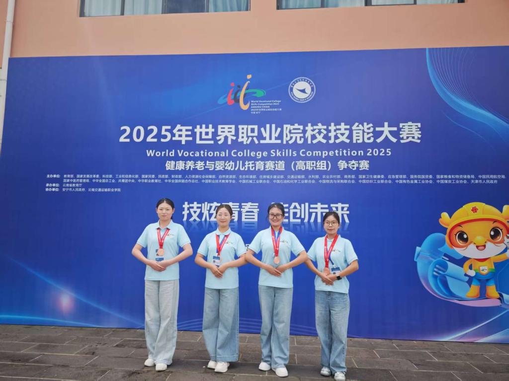 8月28日至9月2日,2025年世界职业院校技能大赛健康养老与婴幼儿托育赛道(高职组)在云南交通运输职业学院举办。本届大赛共吸引来自全国155支代表队、601名选手参赛。pp电子高度重视此次赛事,pp电子游戏平台网站派出了由副院长任秋爱教授带队,董玉芬、何宇等指导教师全程陪同,智慧健康养老服务与管理专业的杨卓越、赵可妍、常秀秀、刘琳钰等4名同学组成的师生代表队参赛。赛场上学生凭借扎实的专业功底、规范的实操能力和出色的临场表现,最终荣获铜奖。