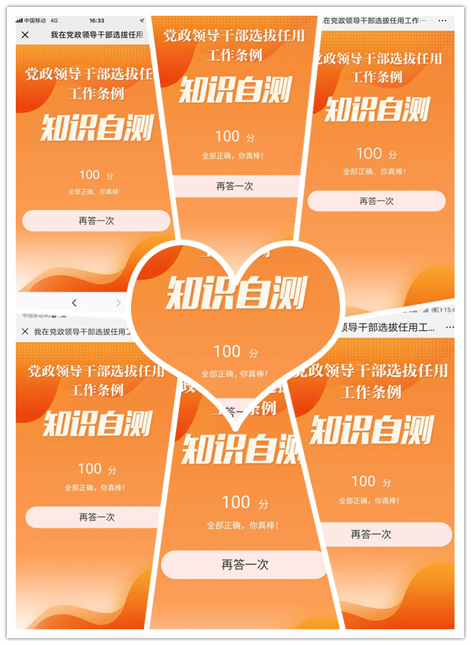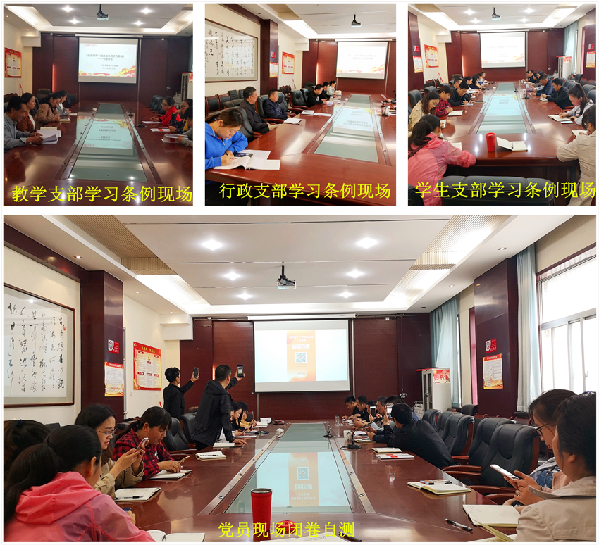 王剑、郭宇森、学生党支部组织委员乔欢分别带领全体党员通读了《党政领导干部选拔任用工作条例》全文。各支部书记要求党员干部深刻理解《条例》内容,重点领会新修订的《条例》中强调的突出政治标准、落实从严要求、激励担当作为、拓宽选用视野、体现精准科学、推动务实高效等6各方面的内容。各党支部组织全体党员以闭卷形式完成《条例》知识自测。pp电子党员干部认真学习《条例》内容,一个小时后,全部满分完成《条例》知识自测。