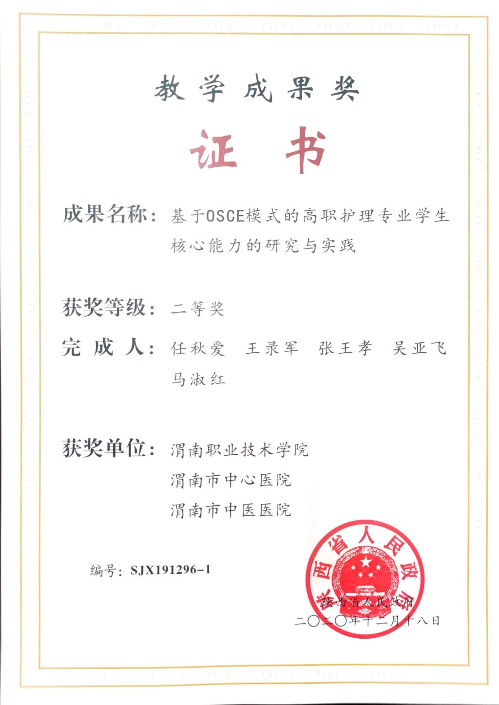 近日,陕西省人民政府办公厅下发了《关于表彰2019年高等教育教学成果奖获奖项目的通报》(陕政办函〔2020〕137号),我校pp电子游戏平台网站“基于OSCE模式的高职护理专业学生核心能力的研究与实践”荣获省级教学成果二等奖1项,这是pp电子游戏平台网站第二次荣获该奖项。