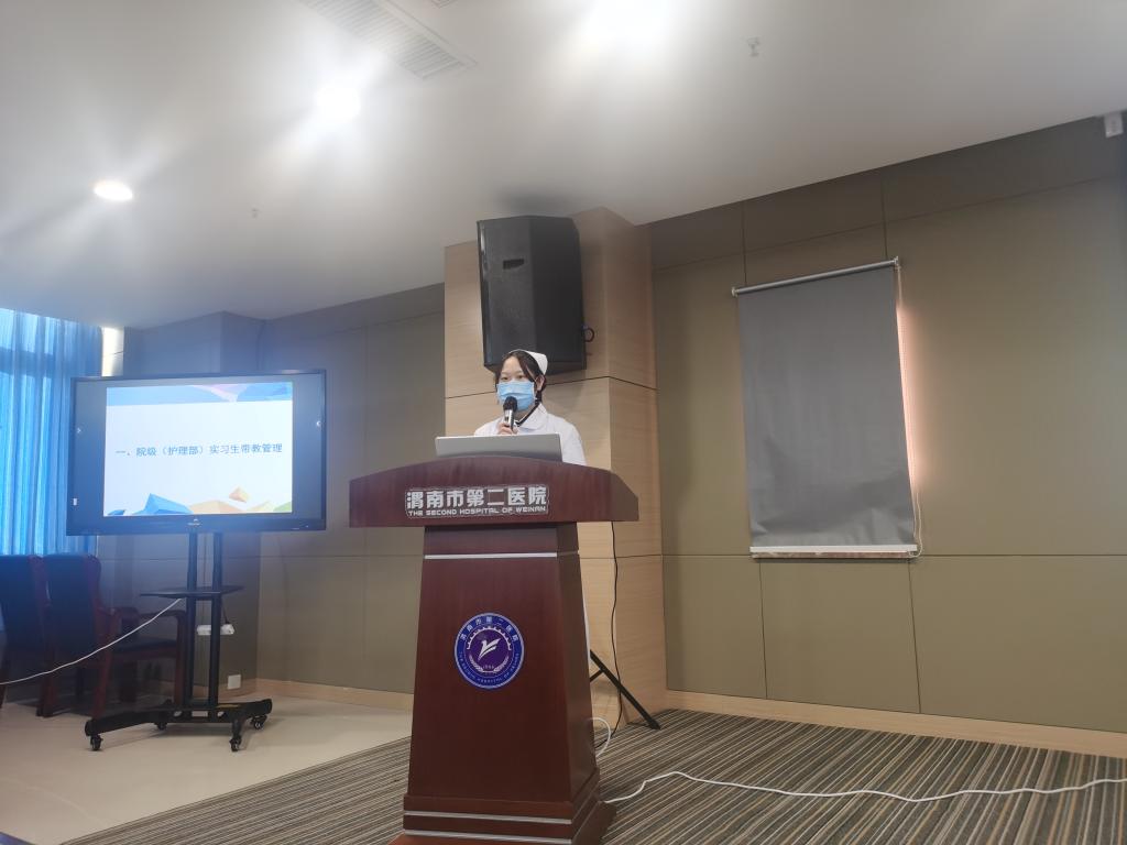 会上,王欣泽向我校检查组介绍了医院实习生的构成、实习生管理制度、岗前培训、老师带教、出科考核、优秀实习生评选、学生的文化生活以及对未来管理的设想,他还特意向全体同学介绍了优秀实习生罗海玉同学。罗海玉的带教老师——产房护士长关月莉说“罗海玉是我带教20多年来见过的最优秀的学生!”罗海玉代表全体实习生用精准的语言罗列了自己在产科的三个月和ICU一个月时间满满的收获,除了知识还有对职业的认识和热爱,她汇报的字里行间让反映出对知识技能的渴望、对全体同学的鼓舞、对医院带教老师的感恩、对未来职业的担当。