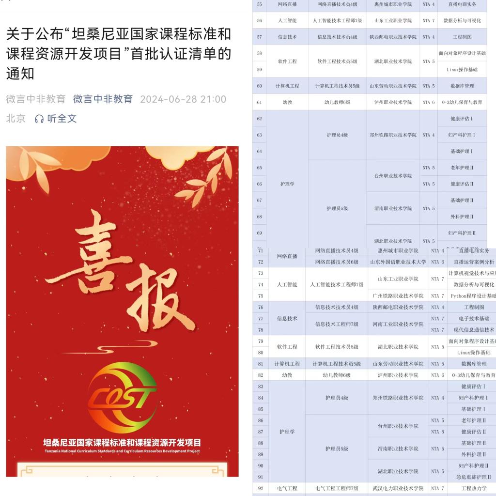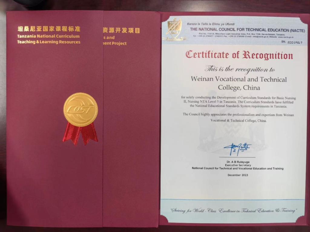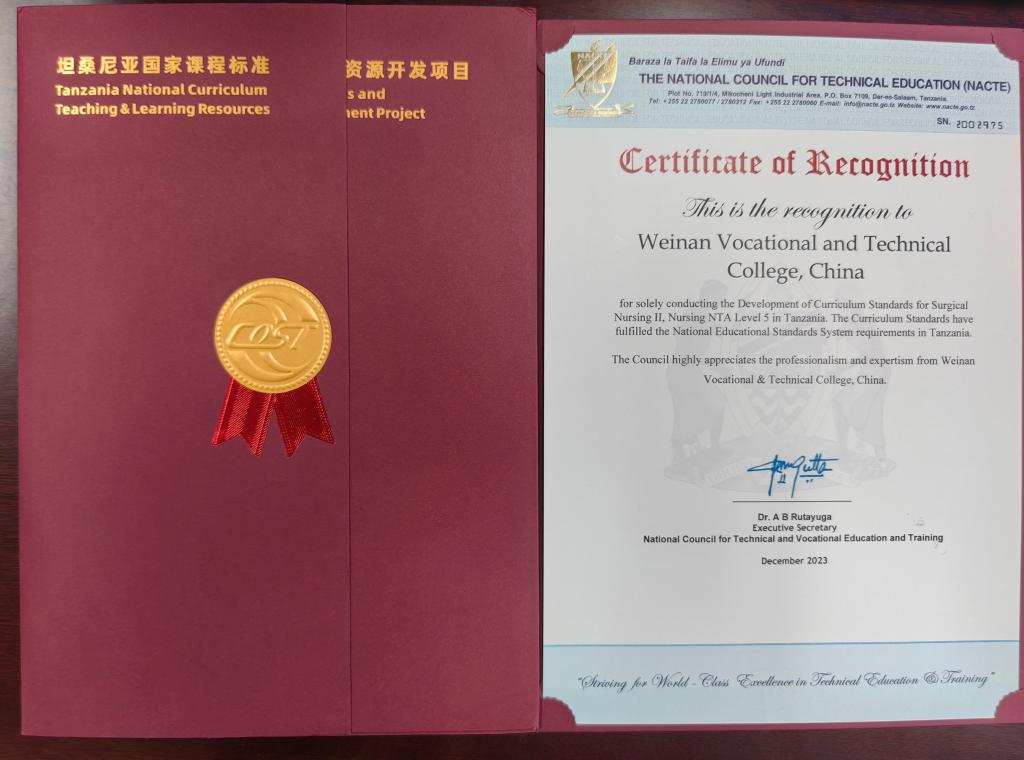 2023年9月中非职业教育联盟组织启动了“坦桑尼亚国家课程标准和课程资源开发项目”,我校护理专业NTA5级《护理学Ⅱ》和《外科护理学Ⅱ》两门课程积极申报立项。立项以来,学校领导高度重视,相关部门大力支持,pp电子游戏平台网站与中非职业教育联盟紧密配合,课程负责人李丰收和席卫娟老师快速反应,组成合作项目课程小组,组织团队人员多次召开专题会议,各成员均具备高度负责态度,以扎实课程、充实内涵、为学校打响课程品牌为己任,团队人员先后研讨、撰写、修改、定稿,和合作方专家多次交流,历经三稿,完美完成本次对外课程输出项目。2门课程标准已被坦桑尼亚国家职业教育委员会审核认证,并签发认证函。