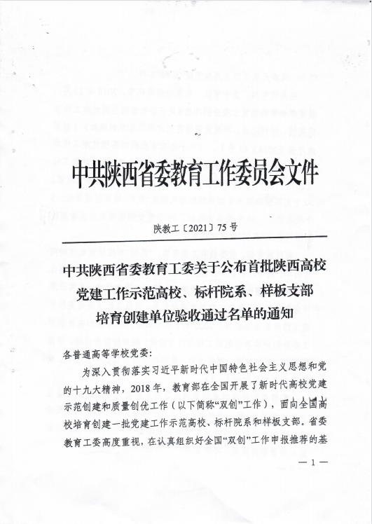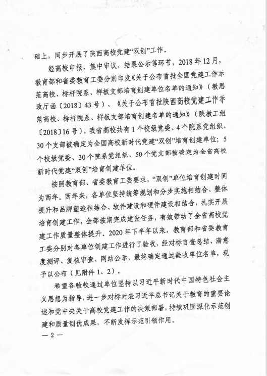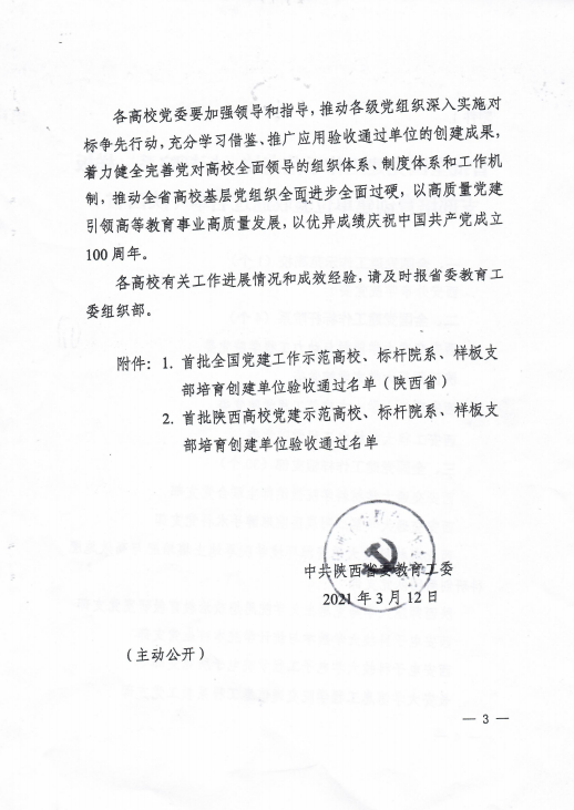 中共陕西省委教育工委关于公布首批陕西高校党建工作示范高校、标杆院系、样板支部培育创建单位验收通过名单的通知