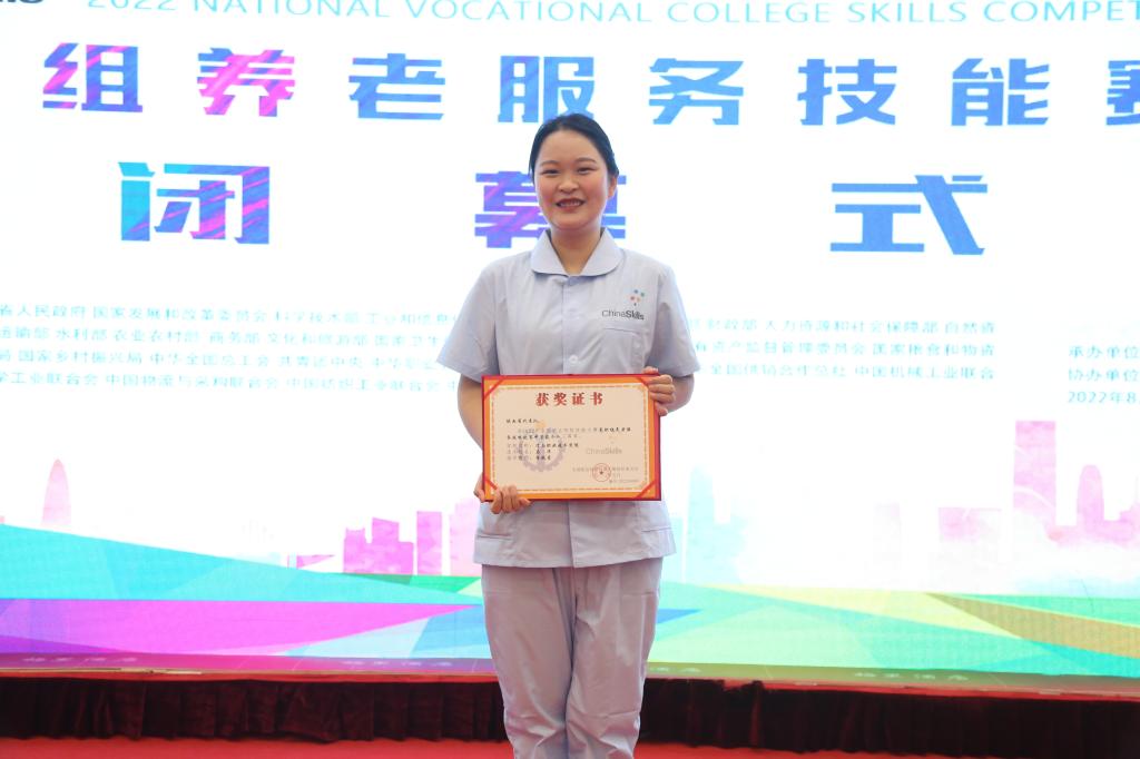 我校智慧健康养老服务与管理专业1901班的马华同学以老年人需求为核心,将专业照护服务有机融入居家社区和机构不同场景。她以娴熟的技能操作、良好的人文关怀、严谨的工作态度全身心投入比赛,经过激烈比拼获得三等奖,这是我校首次在该赛项国赛中获奖。(撰稿人:任秋爱 审核:李晓乾)